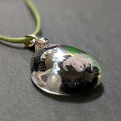 Halskette mit schwarzen/weißen/roséfarbenen Blüten & perlmuttfarbenen Perlen in Tropfenform gegossen, Größe des Anhängers ca. L 3 x B 2 cm.