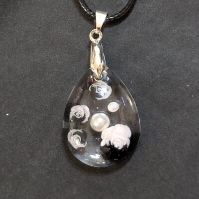 Halskette mit schwarzen/weißen/roséfarbenen Blüten & perlmuttfarbenen Perlen in Tropfenform gegossen, Größe des Anhängers ca. L 3 x B 2 cm.
