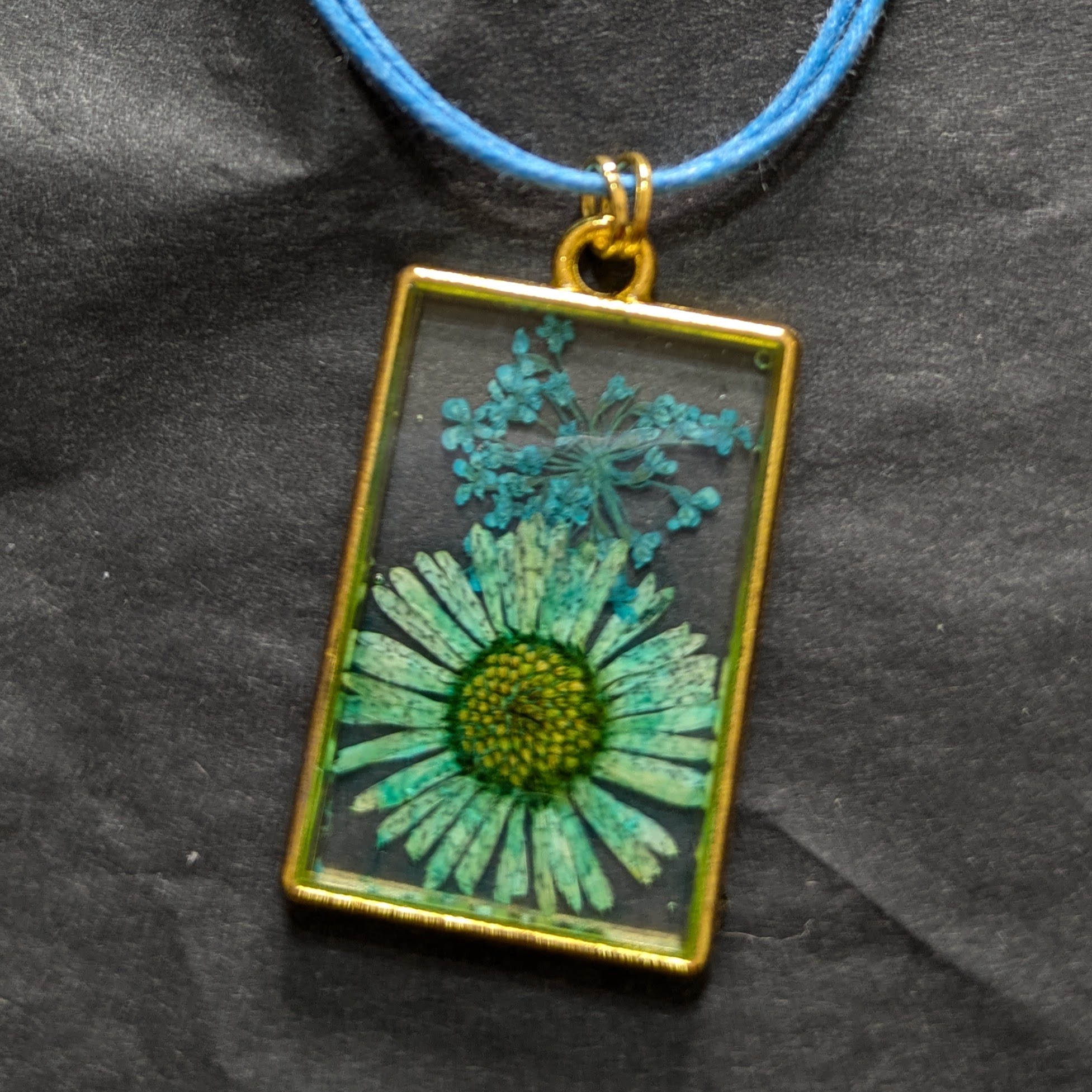 Halskette mit Blüten, transparenter Guss im Messingrahmen, Anhänger mit max. 0,4 cm Dicke, Größe ca. H 3 cm x B 2 cm.