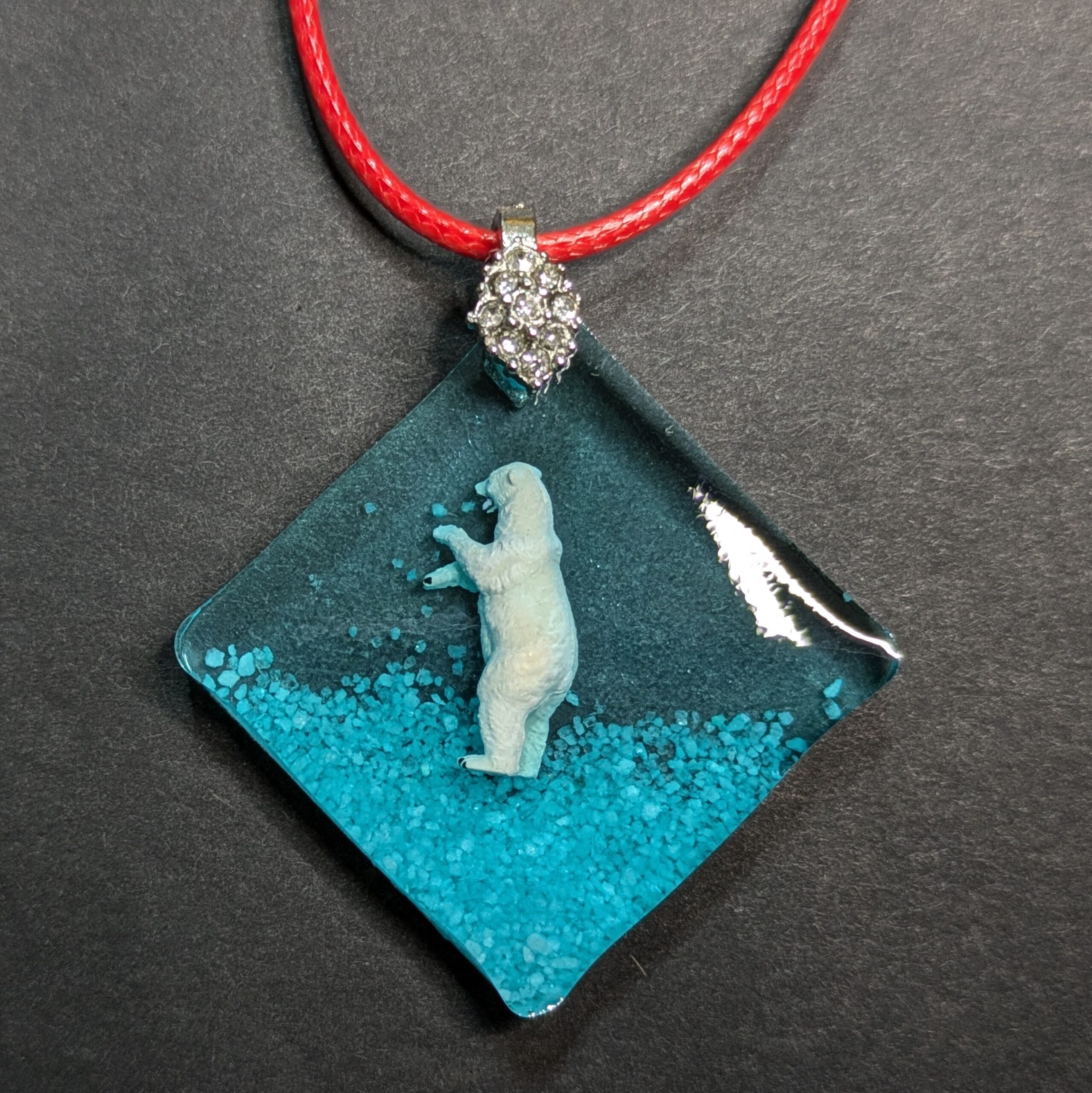 Halskette mit Eisbär, stehend, blau-transparent gegossen. Anhänger auf der Spitze stehend mit max. 0,8 cm Dicke, Größe des Anhängers 3 x 3 cm.