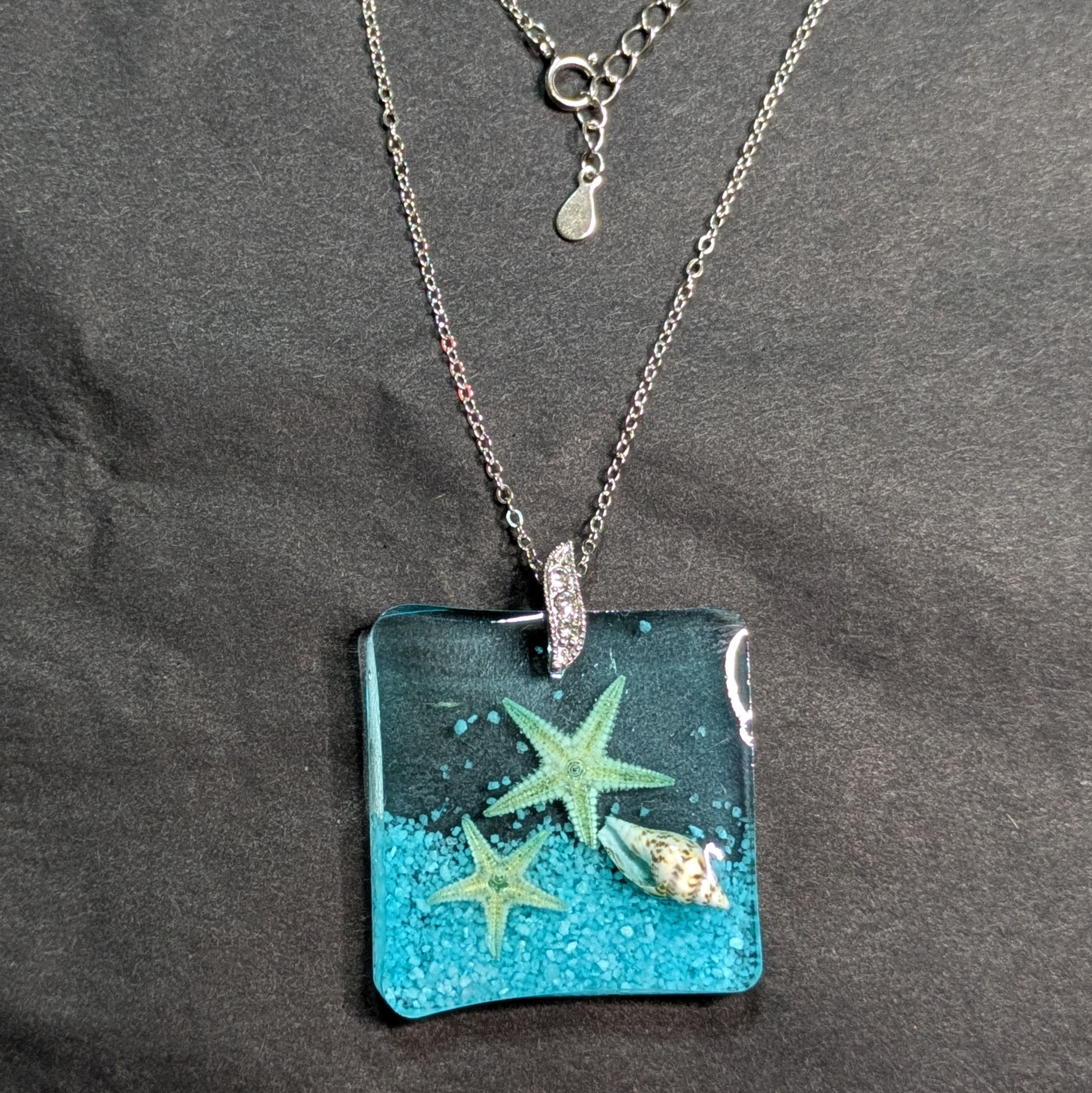 Halskette mit Meeresmotiv, als Relief gegossen, blau-transparent , Anhänger mit max. 0,8 cm Dicke,