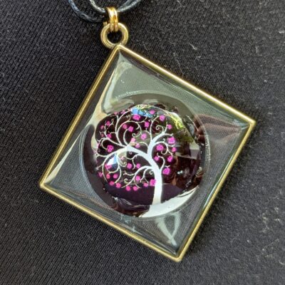 Halskette mit großem Muggelstein, Motiv weißer Baum mit rosa Blüten auf schwarzem Grund, als Relief gegossen, Anhänger mit max. 0,8 cm Dicke, Messing-Rahmen.