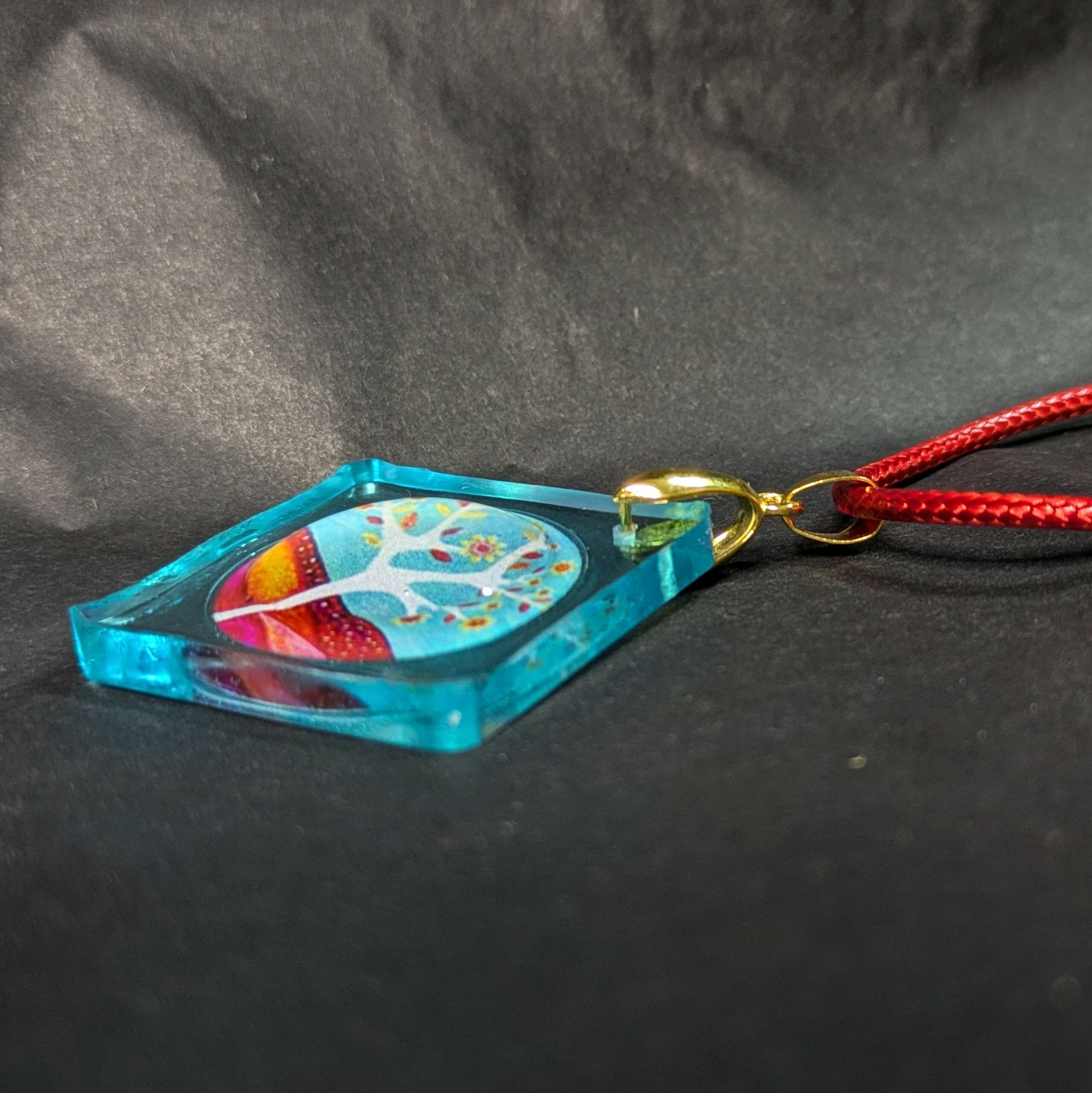 Halskette mit großem Muggelstein, Motiv Baum weiß mit roten Blättern, als Relief gegossen, blau-transparent , Anhänger mit max. 0,8 cm Dicke,