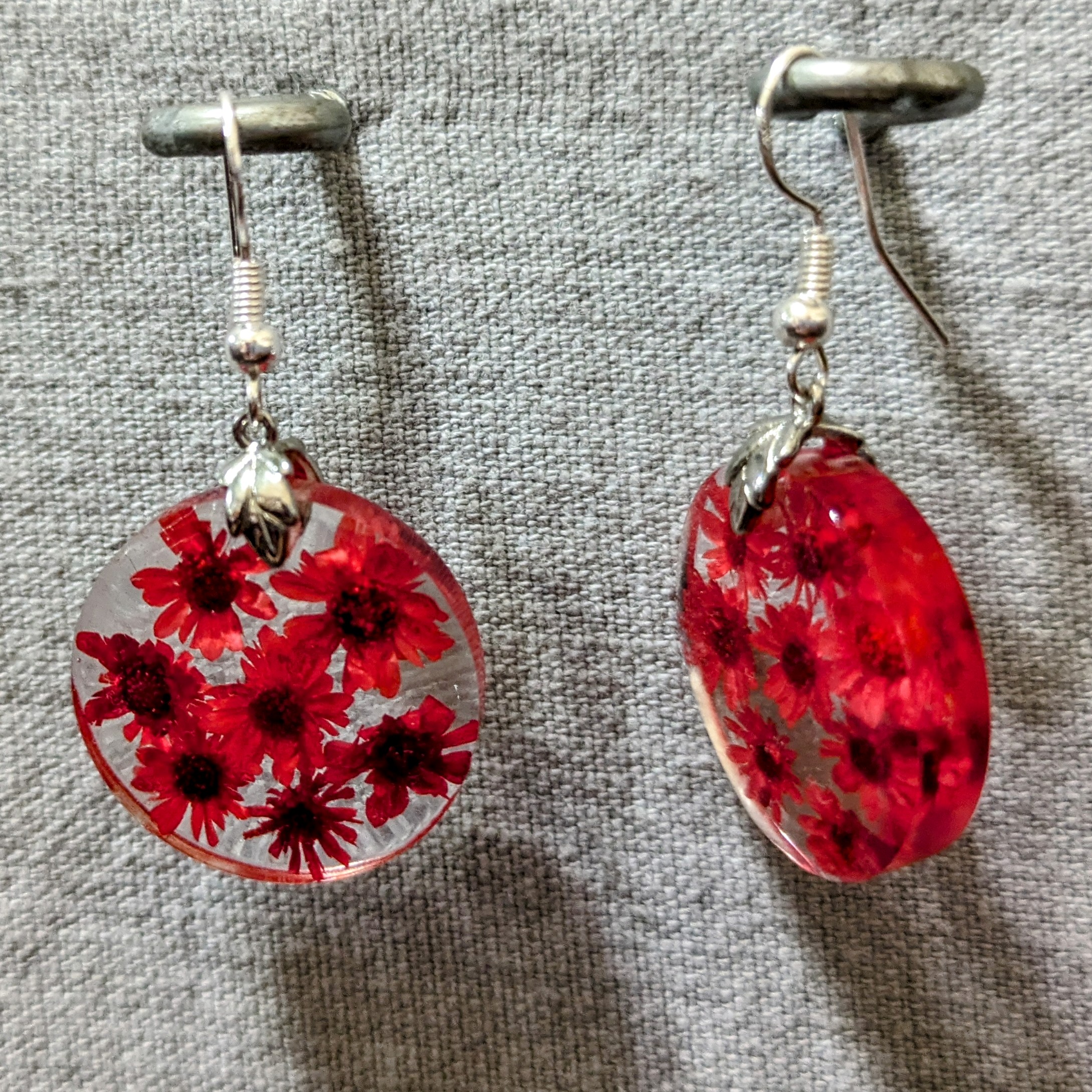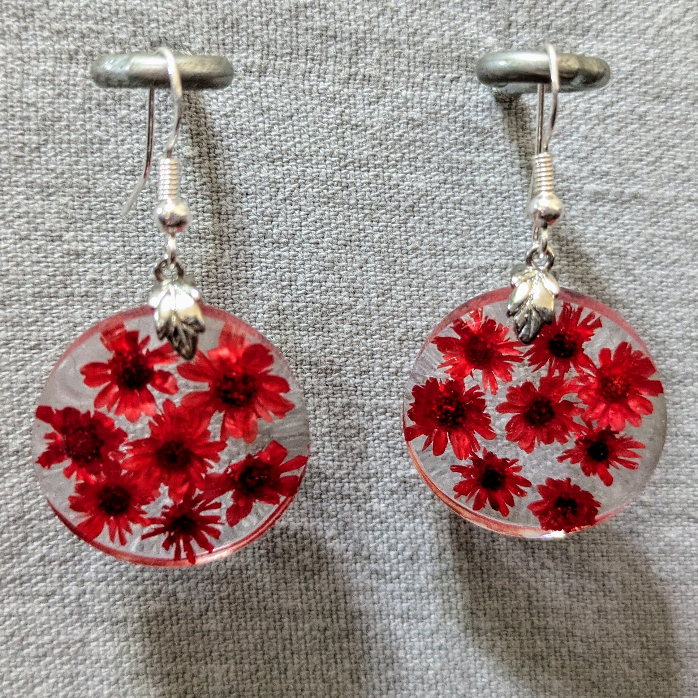 Transparente Ohrringe mit kleinen, roten und ungepressten Blüten gefüllt, mit einer mittleren Dicke von ca. 0,5/0,6 cm, ohne Rahmen.